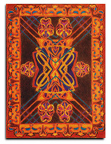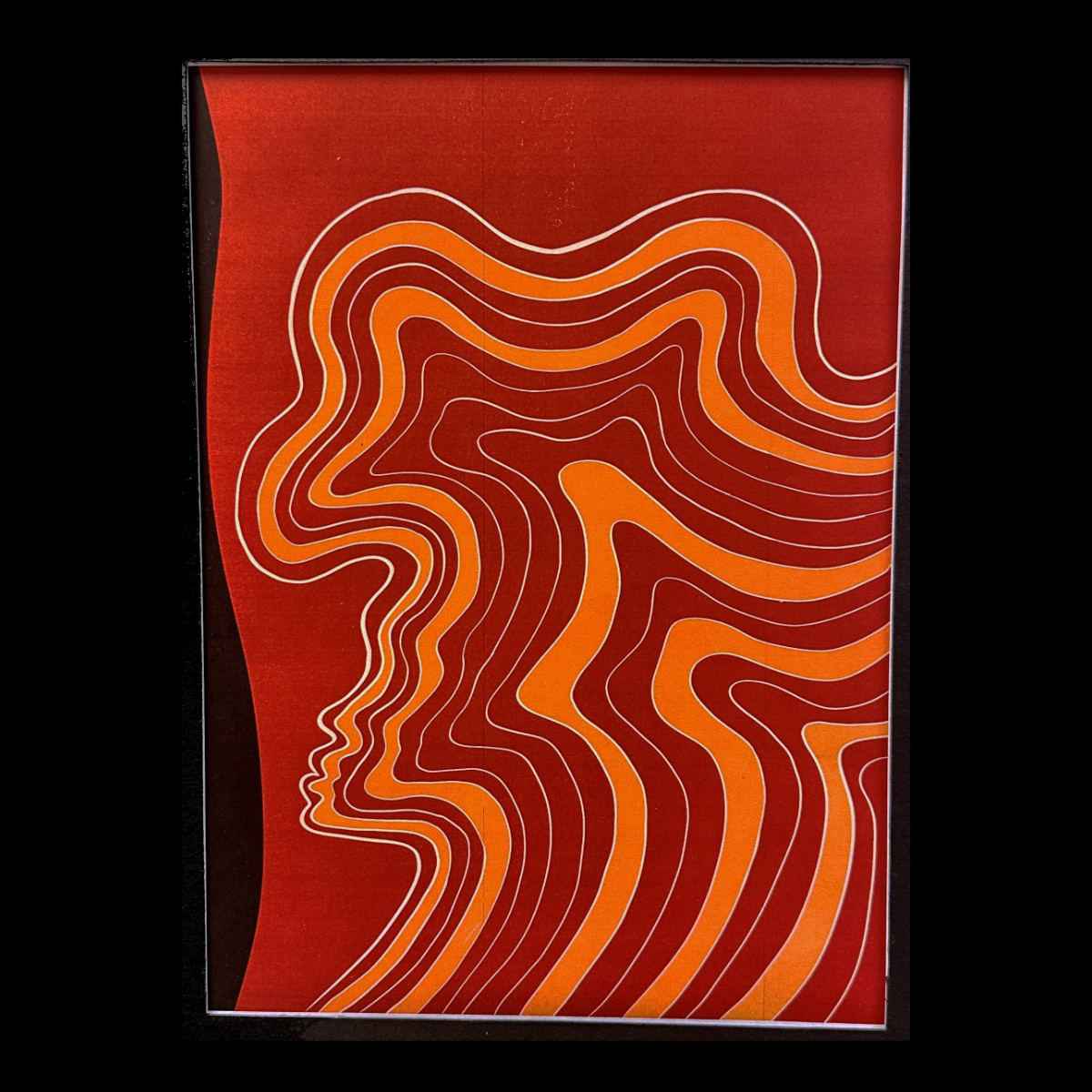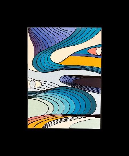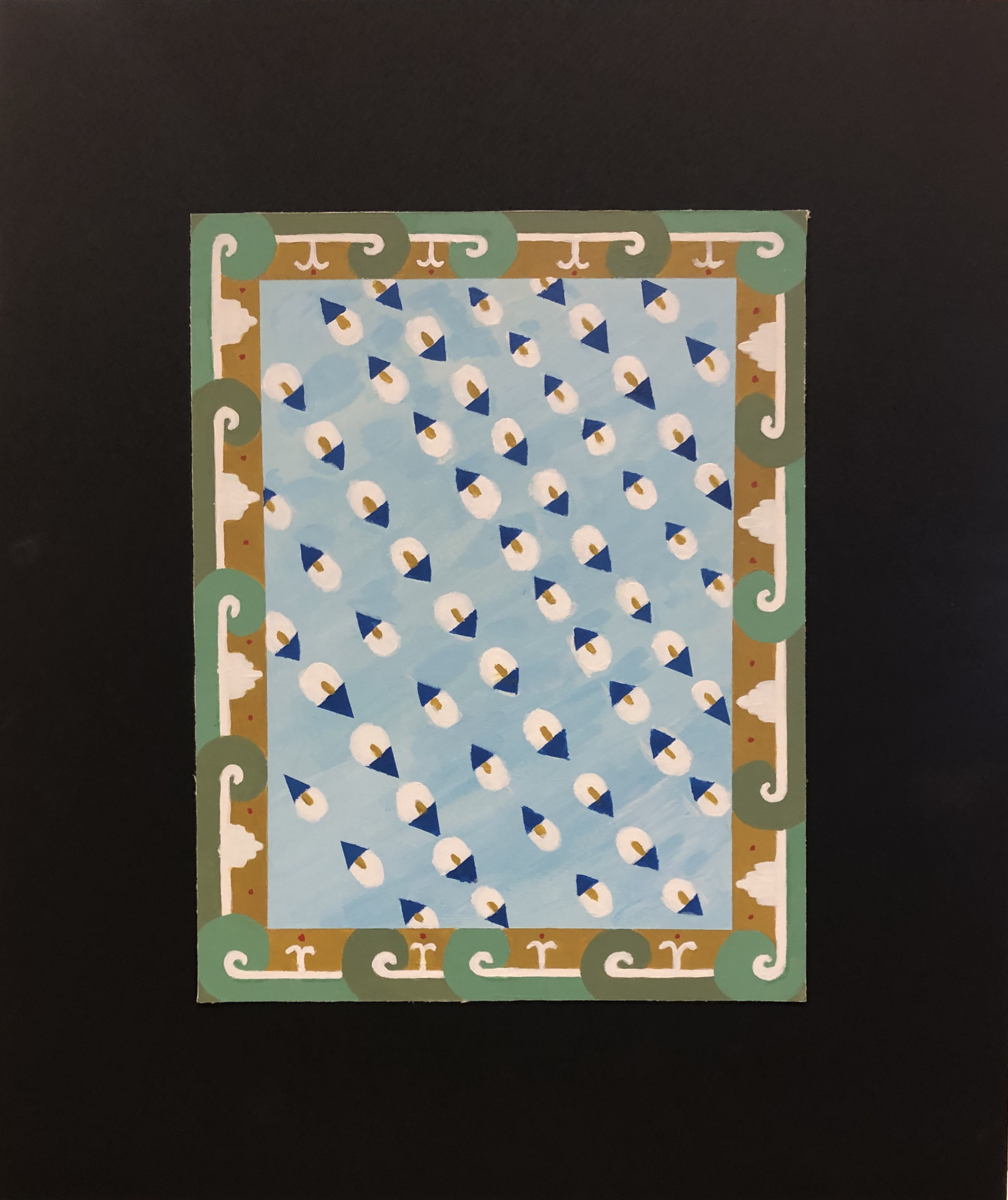 This design channels the dreamlike landscape of surrealism through organic movement. The use of bold colors paired with black lines harkens to the graphic quality of works by Girogio Di Chirico and Salvador Dali. Step gradient swirls create illusions of depth, leading the viewer throughout the composition. Two eyes anchor the design and pay homage to the special treatment eyes, and perception played in Surrealism. This rug could exist in a contemporary space as a statement focal piece.