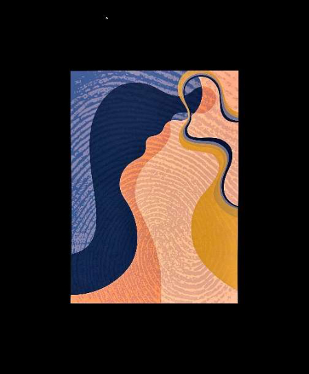 “Woman”. This rug is designed for a cozy feminine interior, and its overall form is a mixture of contemporary and retro styles. The women’s freedom movement in Iran inspires this rug. In this design, the two contrasting colors, “Italian Clay” and “Midnight Blue”, are used to express the gentle presence of women in a dark society. Mid-tones like blue-purples and yellow-mustard drive the color’s narrative and balance, and alongside the curves, feel soft-modern. The surreal intersection of the dark shadow with the soft clay pink, which shows the image of a woman’s face with its curved form, signifies a woman’s resistance against the surreal shadow of tyranny. A wavy curve on the right side of the design expresses the women’s hair tied around the neck of a dictator. Also, a woman’s fingerprint has been used for the background texture. The reason for this choice is to illustrate women’s determination to change the