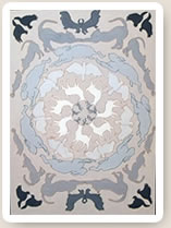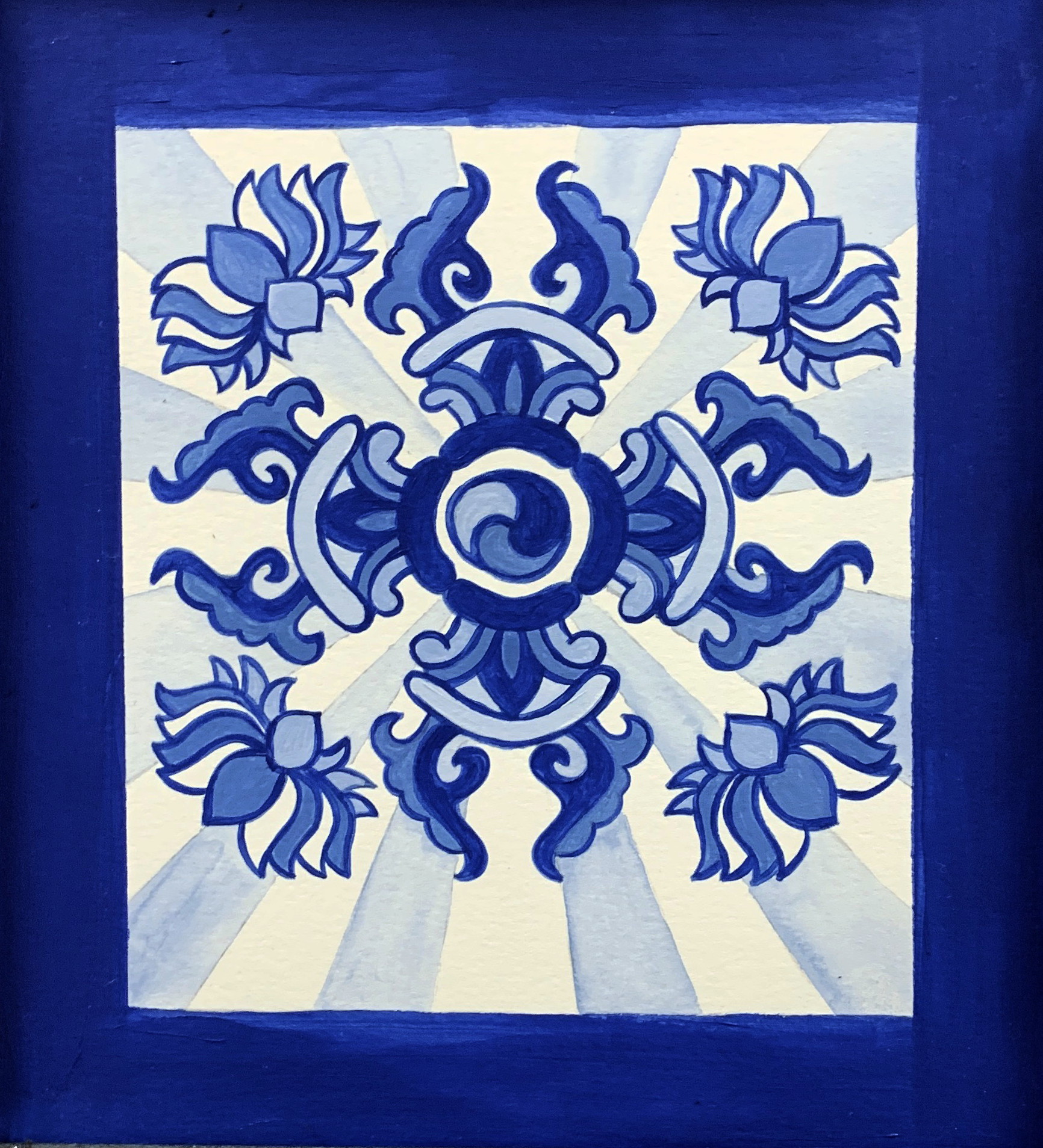empowerment. With so many distressing issues occurring worldwide, that we’re all facing collectively, I find it very important for us to seek peace and healing during times of transition. The color I’ve selected (Cobalt Blue) is a descendant of the color Azure Blue which can be linked to the Blue Buddha. This color in Tibetan culture represents tranquility, ascension, infinite, purity and healing. I’ve selected the Buddhist culture for my design inspiration because this culture shares similar values to my core values as an artist, such as the Four Noble Truths, which Buddha taught, the truth of suffering, the truth of the cause of suffering, the truth of the end of suffering, and the truth of the path that frees us from suffering. The thesis for my design is focused on the importance of alinement and balance in the world of experience. At the center of the composition is an abstract depiction of the Yin and Yang, symbol which represent balance. The shapes around the center can be represented as communities acting as a support structure. The surrounding Lotus flowers symbolize the enlightenment we will find collectively when we learn to work, live and love together. The rays beaming out of the composition represent the sun which is the source of life. I believe we’re all searching for truth and peace in our lives. I feel this design can speak to many target segments and be appreciated in home settings, many public settings such as office spaces, hospitals, school libraries or almost anywhere were individuals are seeking to find a sense of calmness or grounding during their day to day.