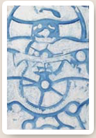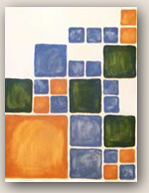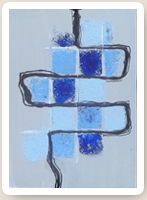 The blue squares represent the revelation collection of the Pewabic Pottery. The blue is the riverfront mosaic, which signifies the Detroit River. The black line is an abstract form of the Detroit skyline. It is done with imperfection to represent the arts and crafts movement. The black line and blue squares are intertwined to show that the old and new buildings in Detroit are still today created by using Pewabic Pottery.