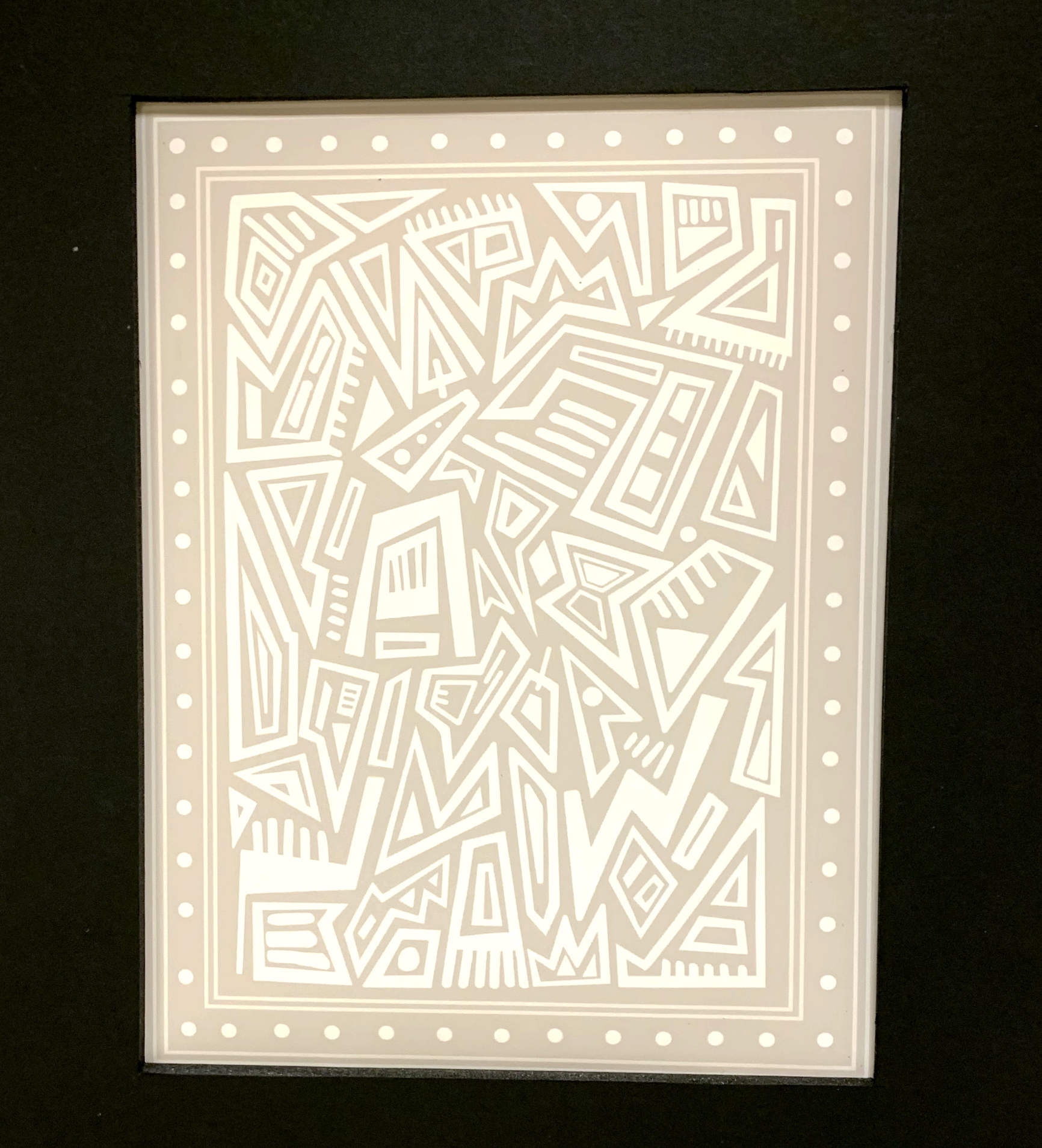 African culture, because they represent their strong connection to the cosmos. An inverted triangle symbolizes the stars and/or the sun while a triangle resting “upright” symbolizes earth. Their connection to the natural world is something I wanted to capture in my design. As for my color choices I chose a two-tone design using white and tan. This color pallet is subdued as I wanted to fit into a buyers existing color pallet. This rug is meant to be used in the home, in a space where people come together. My hope is to inspire others to think about their connection to the natural world while also introducing pattern and variety into their space.