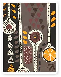 I am the daughter of an amazing woman who is a German immigrant to Detroit, and this design was largely inspired by my mom’s story. I wanted to focus on the importance of family in a strong community, and on my Mom’s irreplaceable influence in my family. I used pattern motifs from German folk art, as well as personal symbols of my mother, such as the central flower. Throughout the design, there are images of more organic forms transitioning into more geometric patterns.This is my attempt to depict how the variety of people and families here in Detroit combine to create a beautiful structure. The environment where I see this rug being used would be in a lively dining room, under a family table. My intent was to create an image consisting of spoon-shapes adding a delicious variety of colorful things to the design.The rug would be an appetizing reminder of a family dinner table, and also a depiction of Detroit as a “mixing bowl” filled with the great variety of living cultures welcome here.